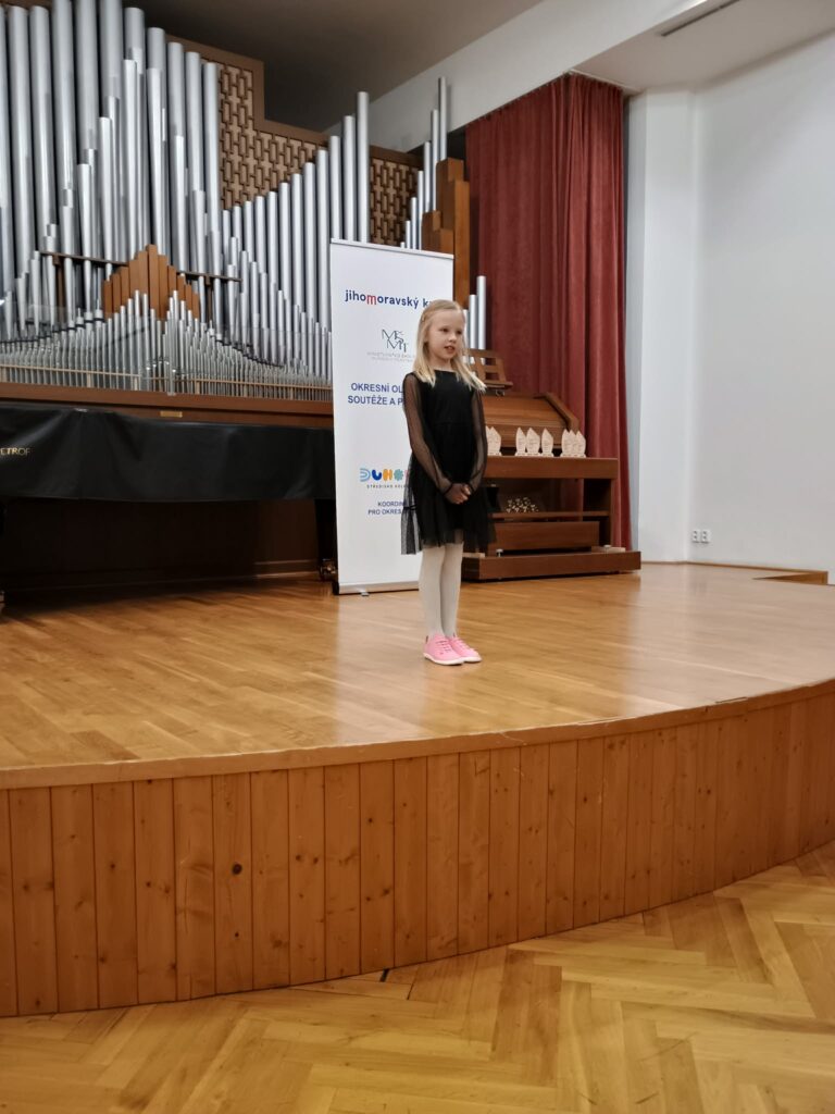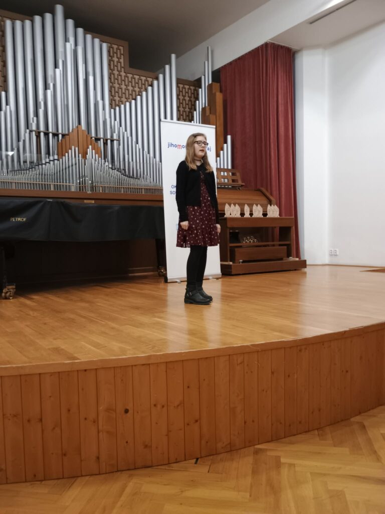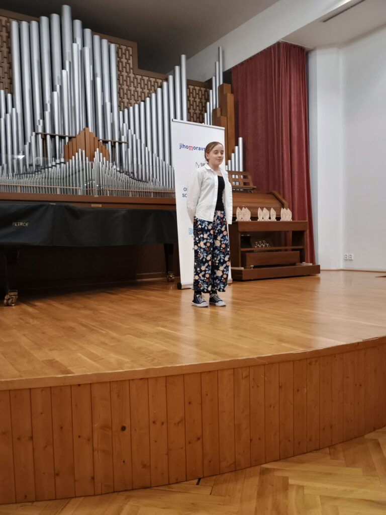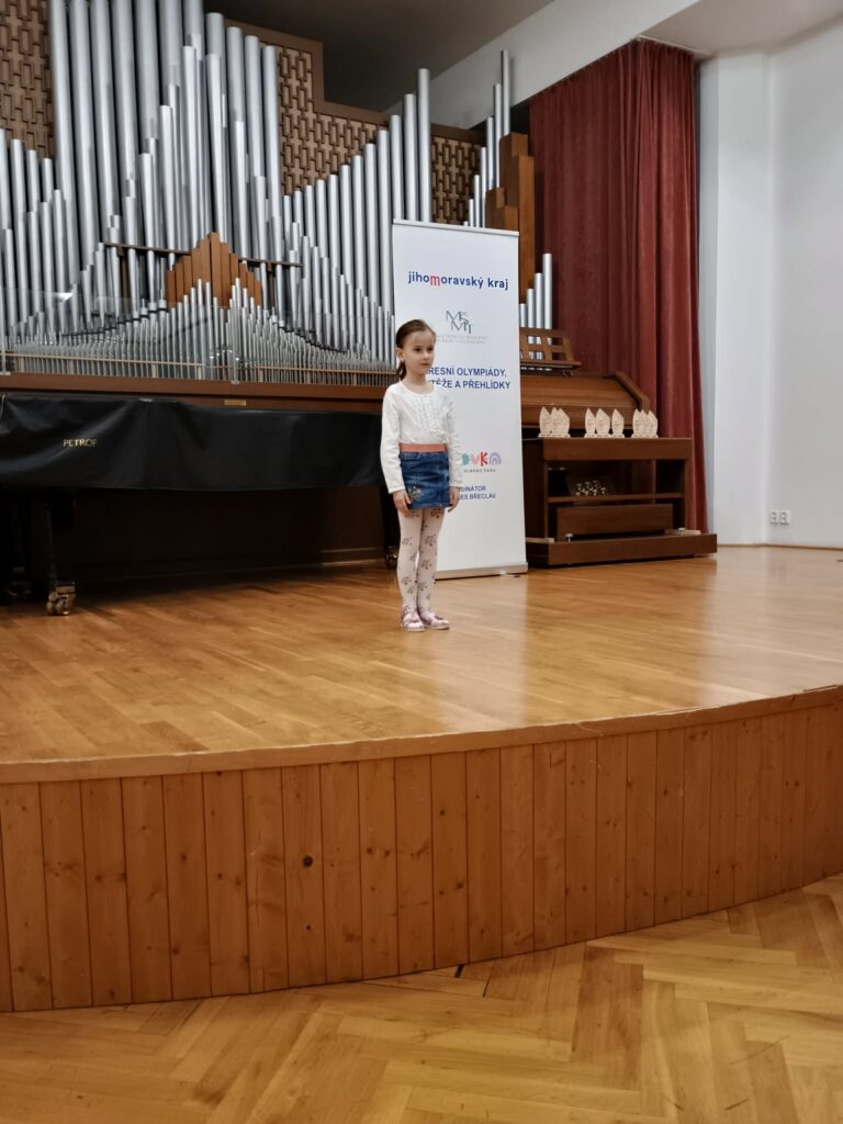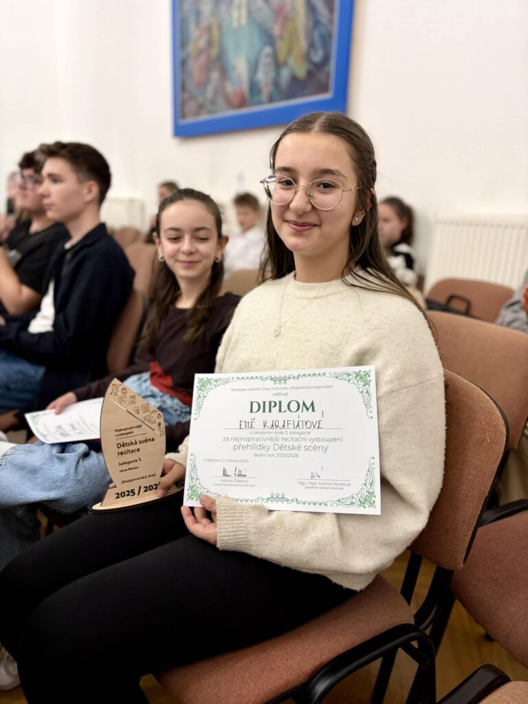 Velkého úspěchu dosáhla žákyně 7. ročníku Ema Karafiátová, která ve 3. kategorii získala cenu za nejinspirativnější projev a zároveň postoupila do krajského kola soutěže.