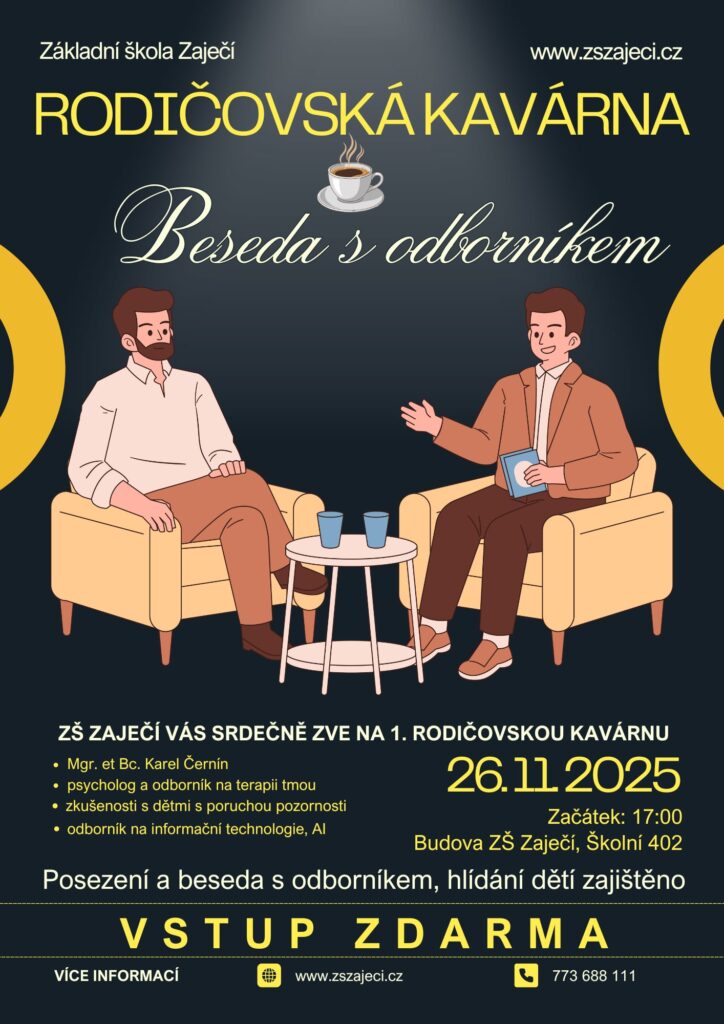 V listopadu tohoto roku jsme se rozhodli uspořádat akci také pro rodiče našich žáků – Rodičovskou kavárnu. K prvnímu posezení u kávy a drobného občerstvení jsme pozvali Mgr. Karla Černína, psychologa a odborníka, který si s námi povídal o různých typech poruch pozornosti, např. ADHD, ADD a dalších, a o tom, jak s nimi můžeme jako rodiče v běžném životě pracovat pro zlepšení kvality života dítěte i celé rodiny.