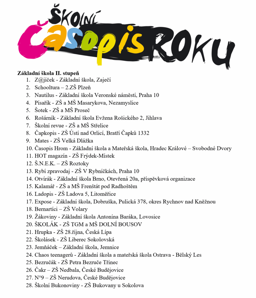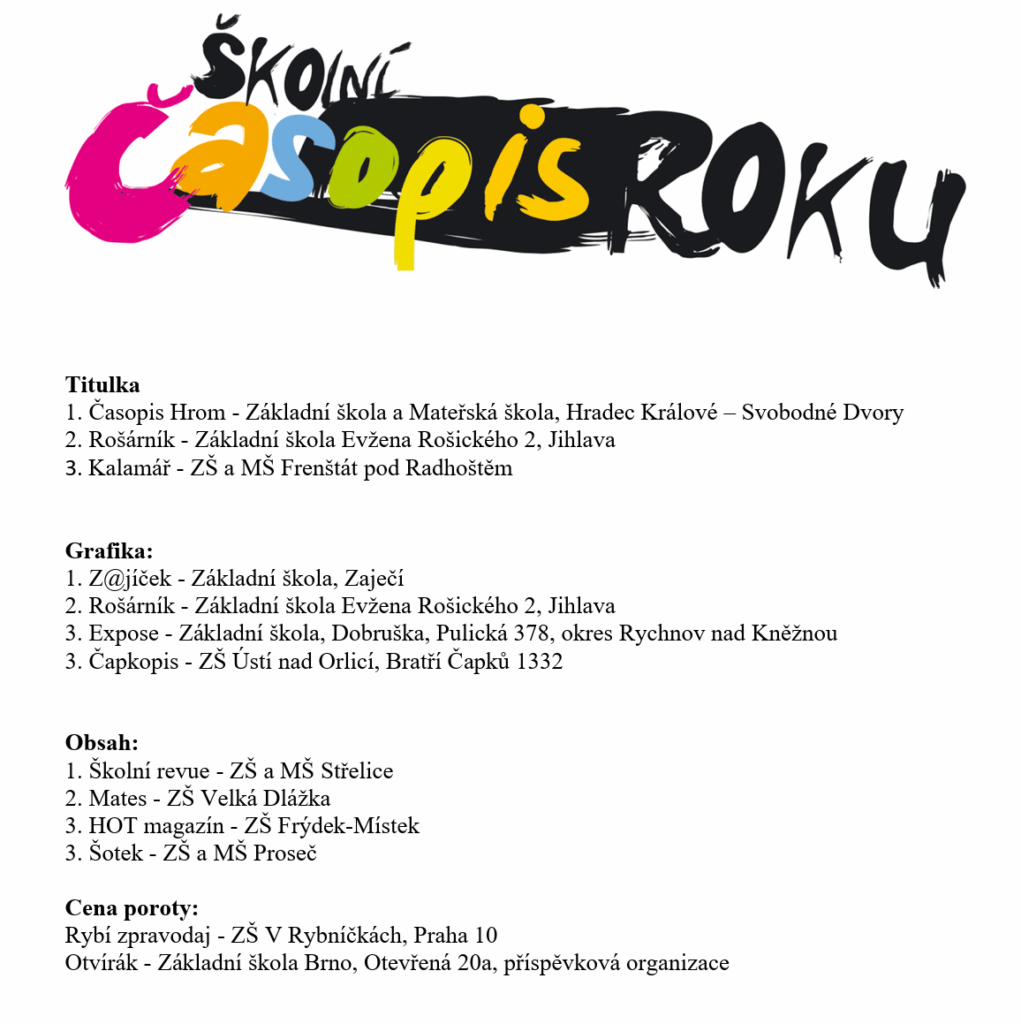 Je nám velkou ctí oznámit, že Z@jíček vyhrál 1. místo za nejlepší školní časopis v ČR v kategorii II. stupně ZŠ!